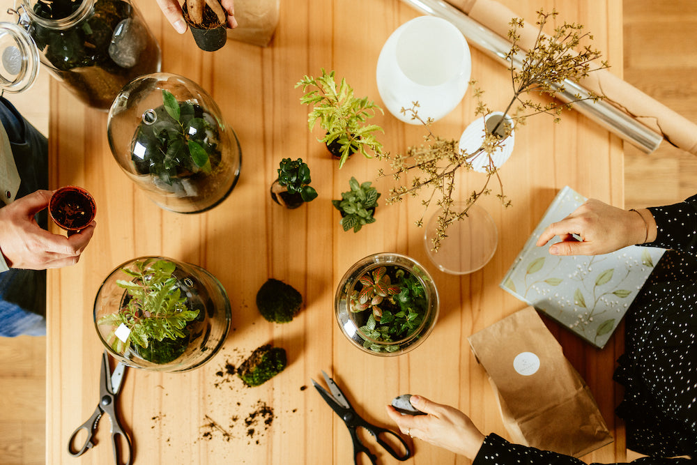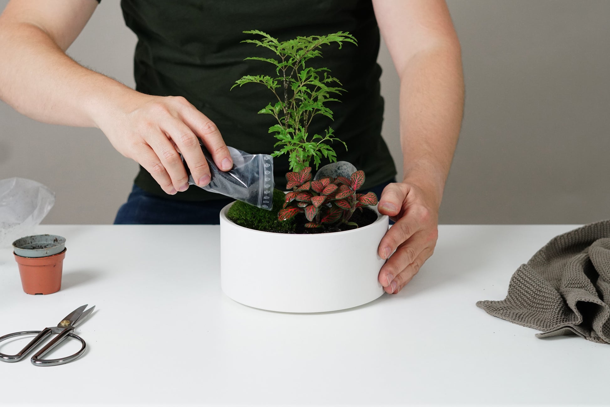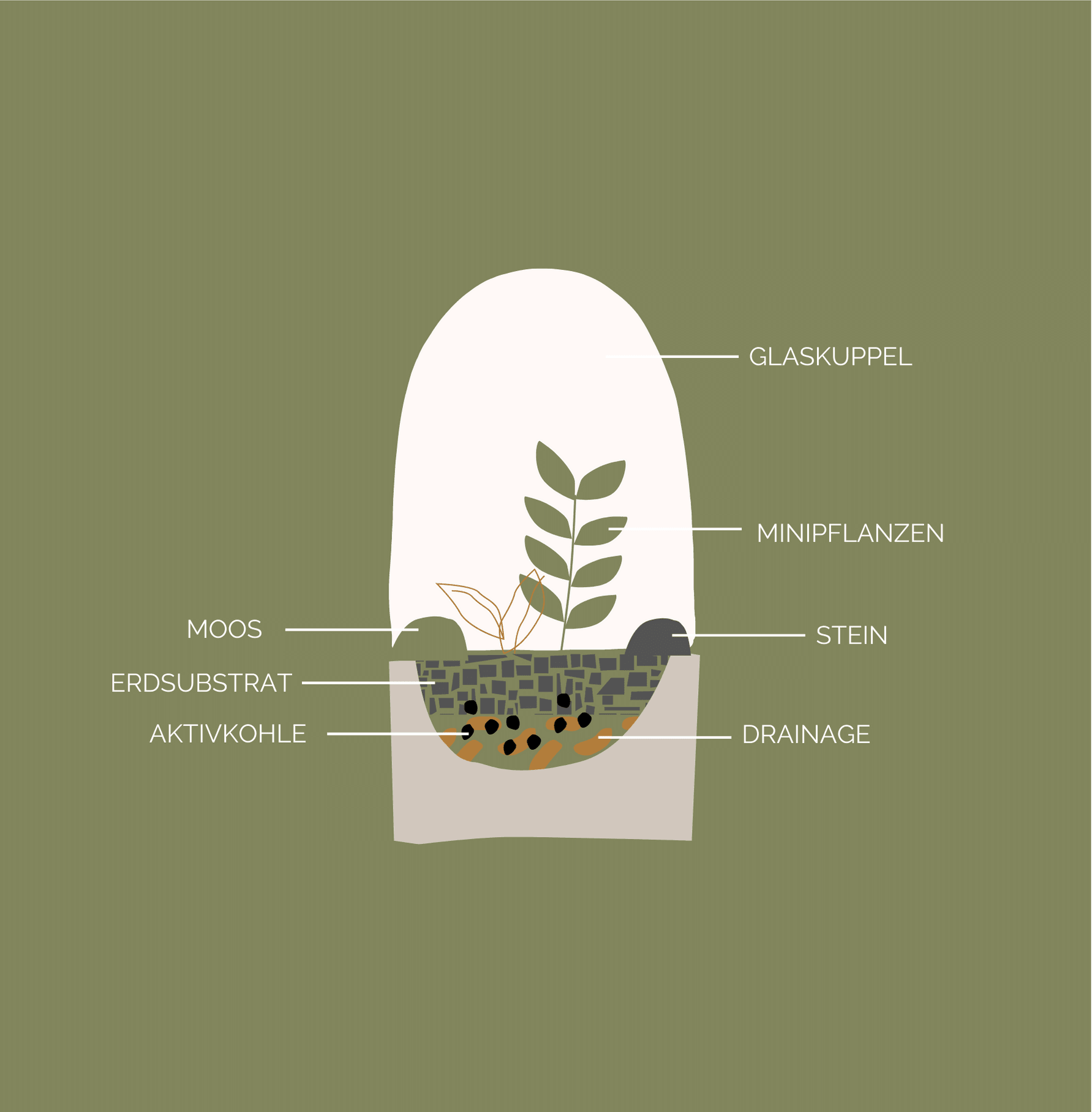 Zum Set gehören außerdem Lava-Kies als Drainageschicht, Aktivkohle-Granulat zur Vorbeugung von Schimmelbildung, Pflanzsubstrat, ein Dekorationsstein, ein Moospolster und zwei Pflanzen.